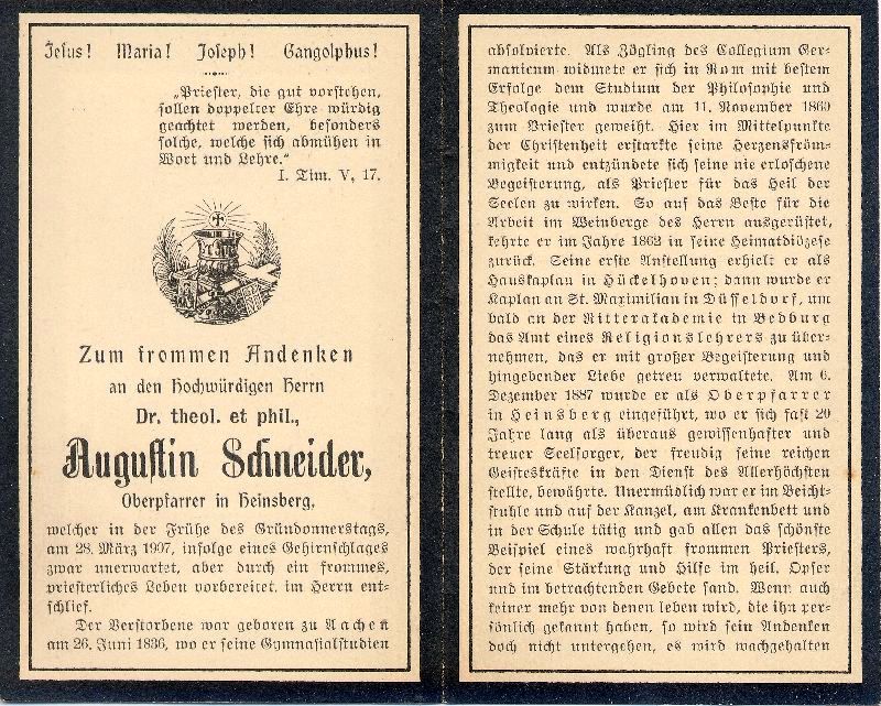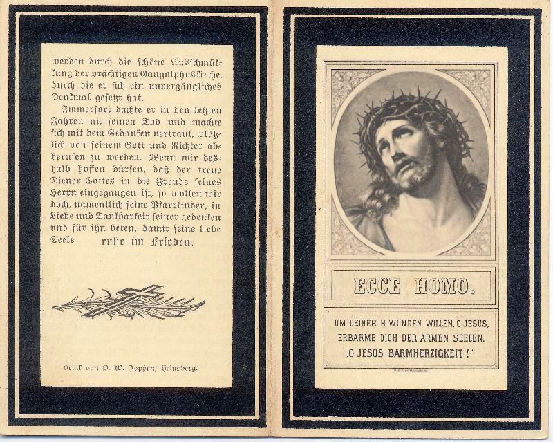 Gehirnschlag; Studium am Collegium Germanicum in Rom; Priesterweihe 11.11.1860; kehrte 1862 von Rom in Heimatdiözese zurück; Hauskaplan in Hückelhoven, dann Kaplan an St. Maximilian in Düsseldorf; bald darauf Religionslehrer an der Ritterakademie in Bedburg; 6.12.1887 Oberpfarrer in Heinsberg, wo er fast 20 J. wirkte; Ausschmückung der Gangolphuskirche |