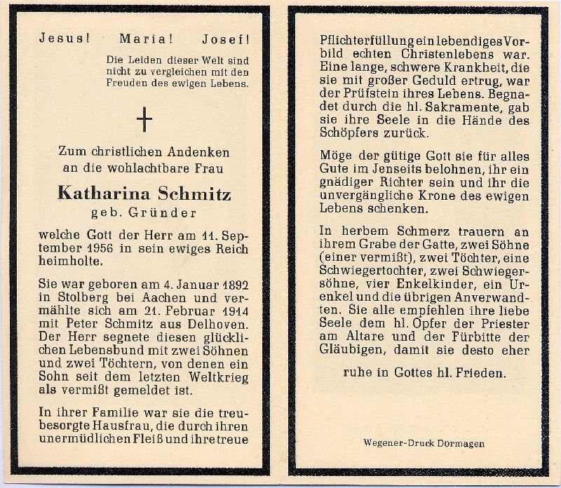 ∞ 21.2.1914 Peter Schmitz aus Delhoven; 4 K., davon 1 Sohn im 2. Weltkrieg vermisst; lange, schwere Krankheit; Druck in Dormagen |