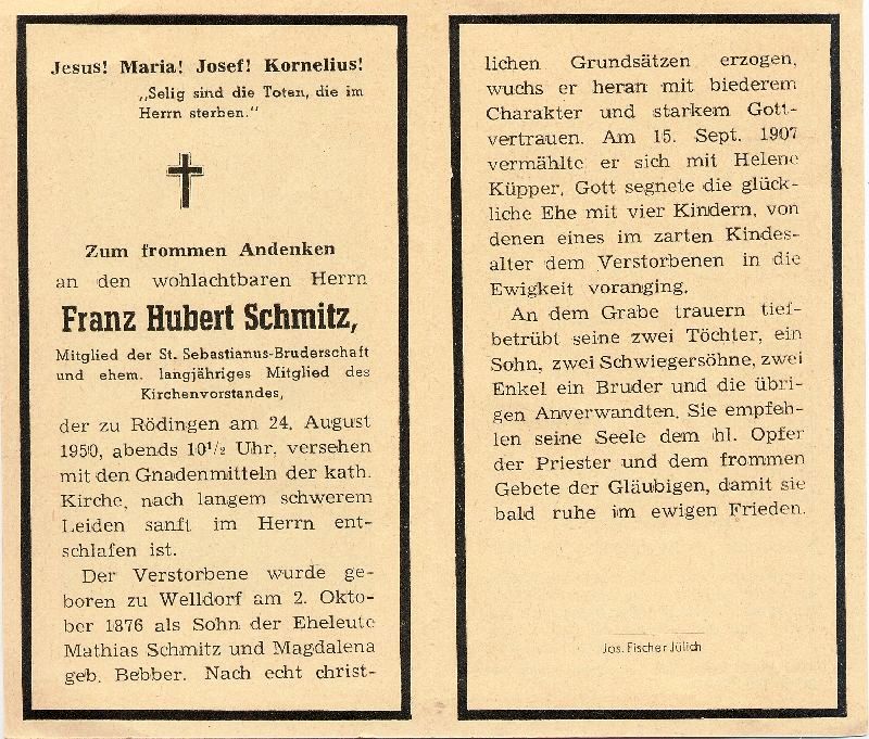 Langes Leiden; Eltern: Mathias Schmitz u. Magdalena geb. Bebber; ∞ 15.9.1907 Helene Küpper; 4 K., davon 1 früh †; Druck in Jülich |