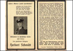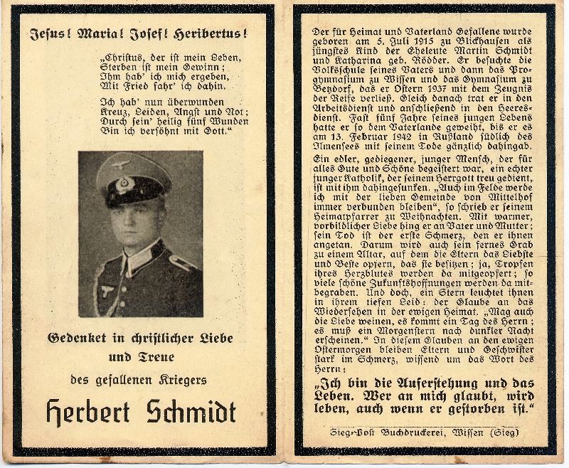 Gefallener 2. Weltkrieg; Eltern: Martin Schmidt u. Katharina geb. Rödder; er besuchte die Volksschule seines Vaters, dann Gymn. Betzdorf, Abitur 1937; anschließend Reichsarbeitsdienst, dann 5 J. Heeresdienst; Druck in Wissen/Sieg |