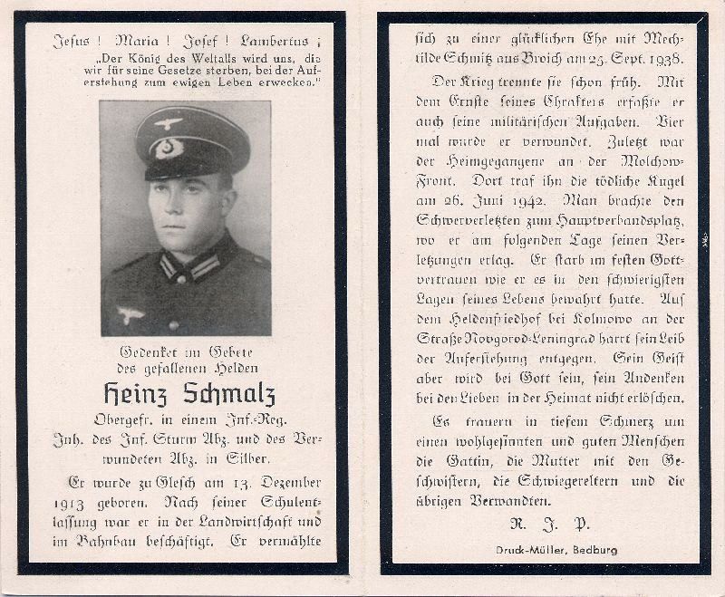 Gefallener 2. Weltkrieg; in der Landwirtschaft u. im Bahnbau beschäftigt; ∞ 25.9.1938 Mechtilde Schmitz aus Broich; als Soldat viermal verwundet; am 26.6.1942 tödlich verwundet; Heldenfriedhof b. Kolmowo an der Straße Nowgorod-Leningrad; Druck in Bedburg/Erft |