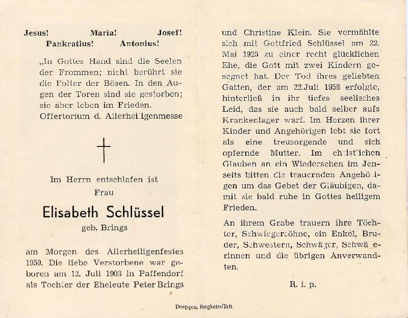 Eltern: Peter Brings u. Christine geb. Klein; ∞ 22.5.1926 Gottfried Schlüssel, † 22.7.1958; 2 K.; Druck in Bedburg/Erft |
