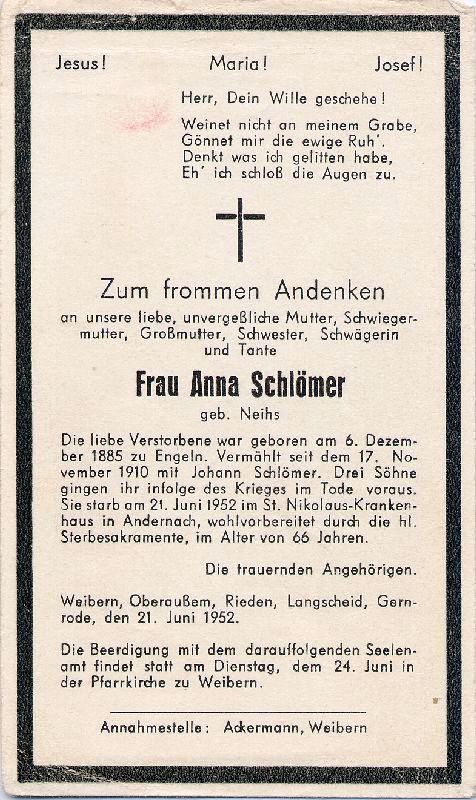 ∞ 17.11.1910 Johann Schlömer; 3 Söhne im 2. Weltkrieg gefallen; Druck in Weibern |