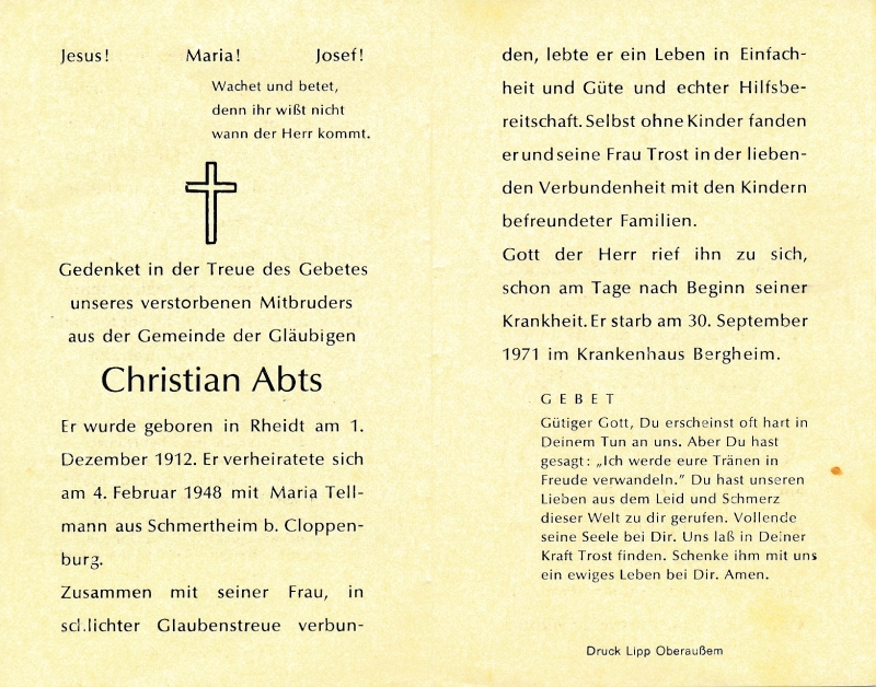∞ 4.2.1948 Maria Tellmann aus Schmertheim b. Cloppenburg; kinderlos |