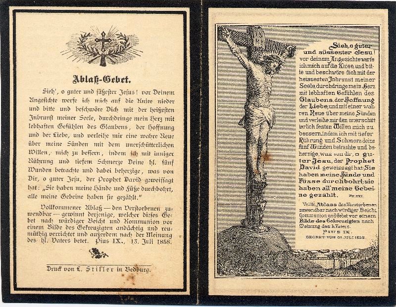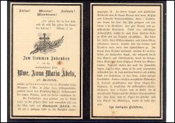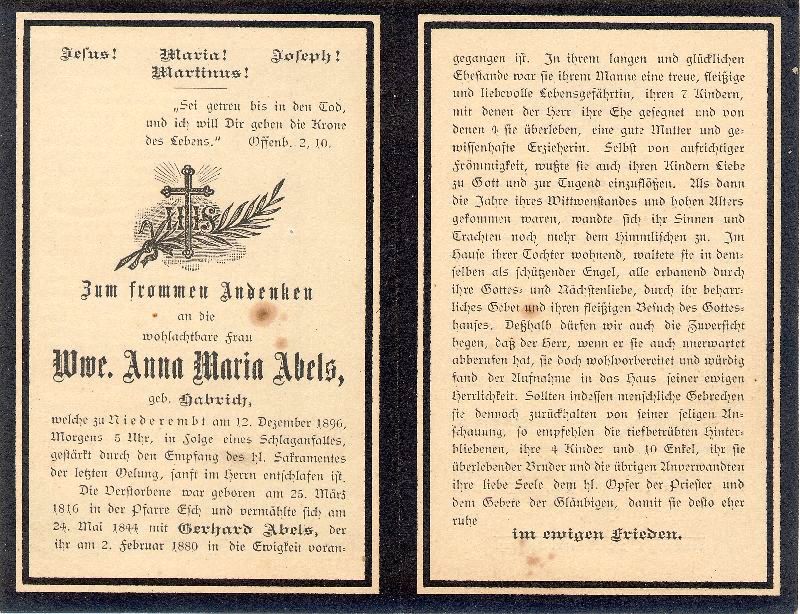 ∞ 24.5.1844 Gerhard Abels, † 2.2.1880; 7 K., davon 3 †; als Witwe im Hause ihrer Tochter wohnend |