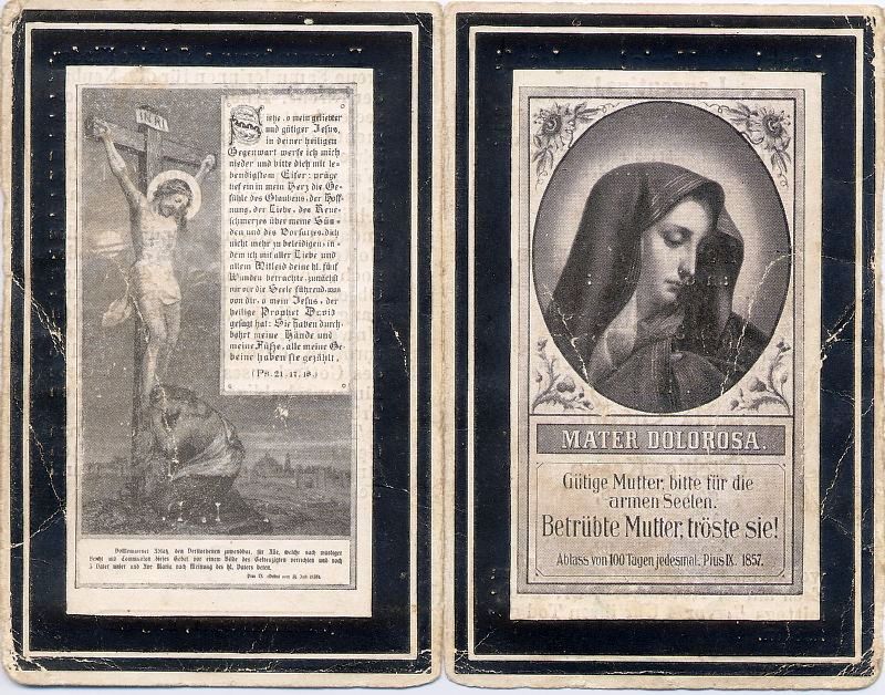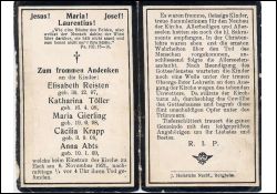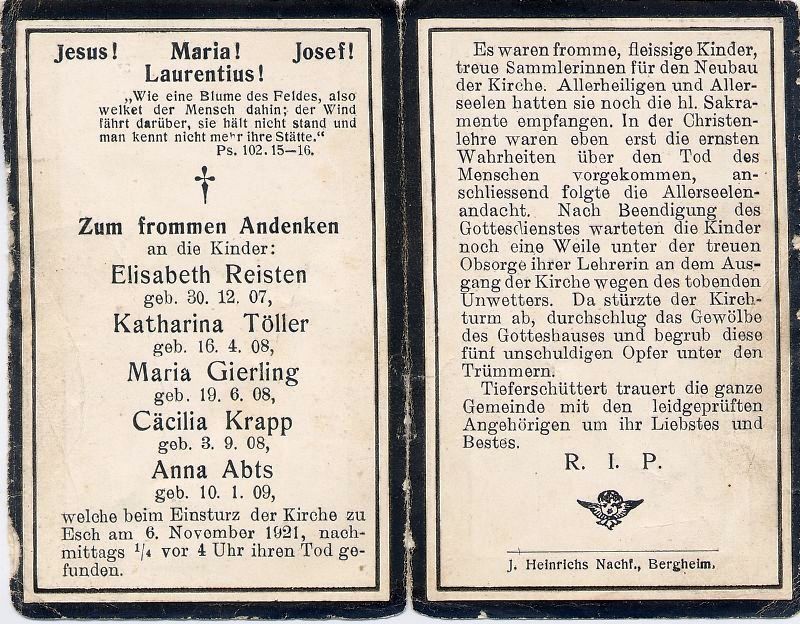 | Tod beim Einsturz der Kirche zu Esch; 5 Kinder; wegen eines Unwetters hatten sie nach der Allersellenandacht mit ihrer Lehrerin am Ausgang der Kirche gewartet; der abstürzende Kirchturm durchschlug das Gewölbe; vgl. Nr. 29037, 28847, 29019, 29038, 29059, 29102 |