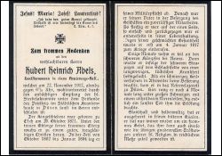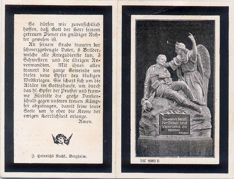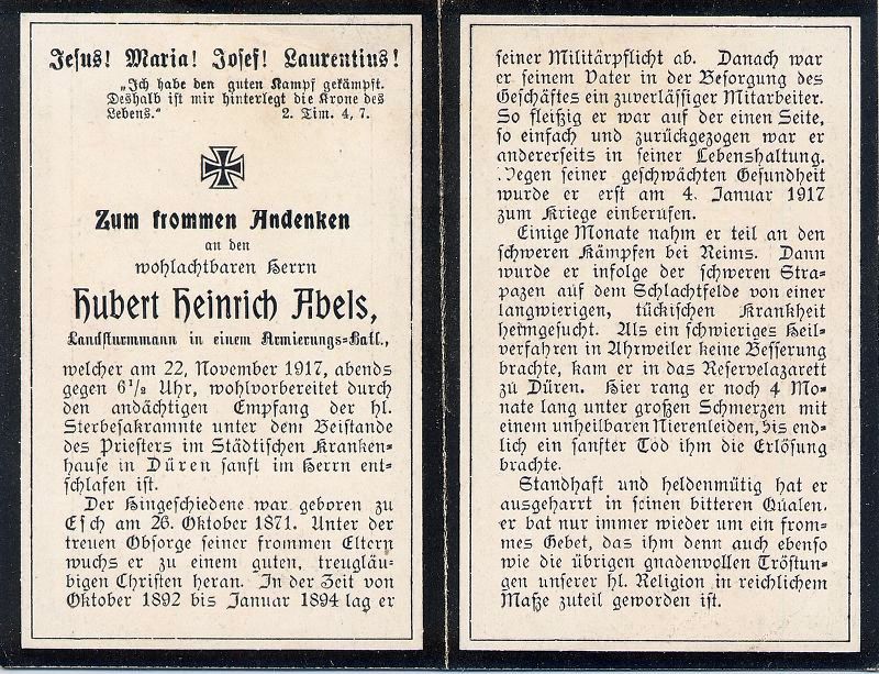 Gefallener 1. Weltkrieg; wegen geschwächter Gesundheit erst am 4.1.1917 zum Militär einberufen; Teilnahme an Kämpfen bei Reims; infolge der Strapazen tückisches Nierenleiden; zuerst Heilverfahren in Ahrweiler, dann Reservelazarett in Düren |