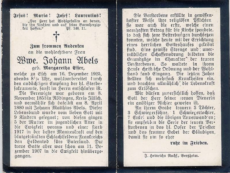 ∞ 8.4.1880 Johann Matthias Abels, † 11.12.1907; 9 K., davon 5 jugendl. †, 1 Sohn im 1. Weltkrieg in Frankreich gefallen; als Erste spendete sie großzügig für die neue Kirche |