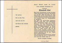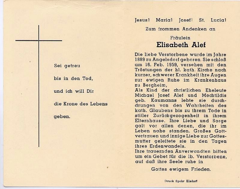 Fräulein; Eltern: Michael Josef Alef u. Mechtildis geb. Kaumanns; Druck in Elsdorf |