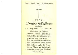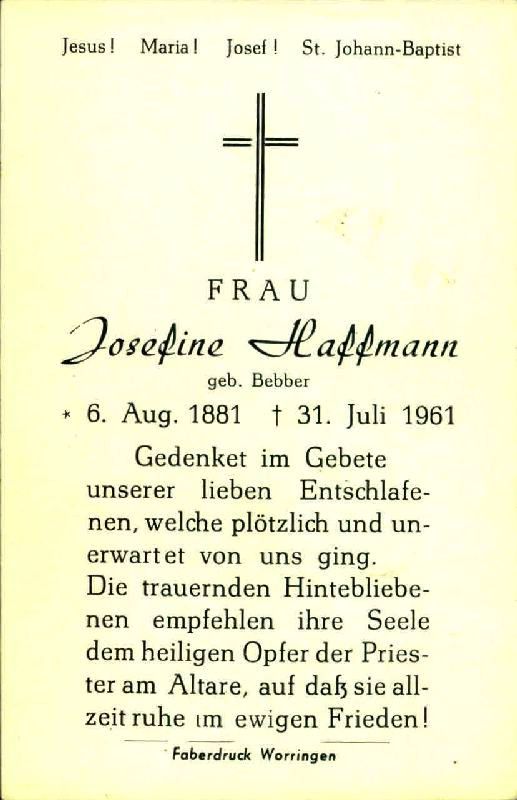 ∞ 3.6.1908 Johann Haffman † 12.1.1960 , 2 Söhne, davon 1 Sohn seit 1915 im Osten vermisst, 1 Tochter |