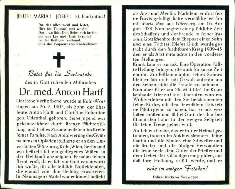 Eltern: Anton Harff u. Christine Hubertine geb. Odenthal; Gymn. Opladen; Studium Medizin; Praxis Neumagen/Mosel; ∞ 16.8.1938 Maria Rom, Würzburg, 1 Sohn, 1 Tochter; bestattet in Worringen |