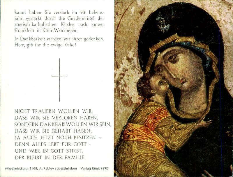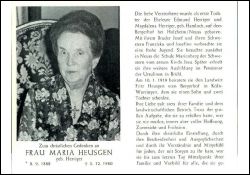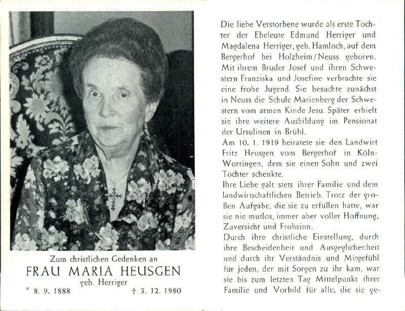 Geb. a. d. Bergerhof/Holzheim; ∞ 10.1.1919 Fritz Heusgen (Bergerhof-Worringen), 1 Sohn, 2 Töchter; Eltern: Edmund Herriger u. Magdalena geb. Hamloch, 1 Bruder, Josef; 2 Schwestern, Franziska u. Josefine |