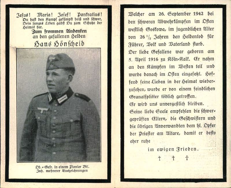 | Gefallener 2. Weltkrieg; Eltern, Geschwister; Totenzettel Worringen |