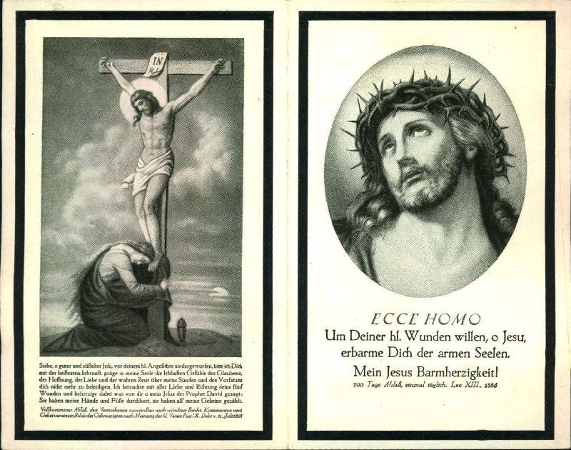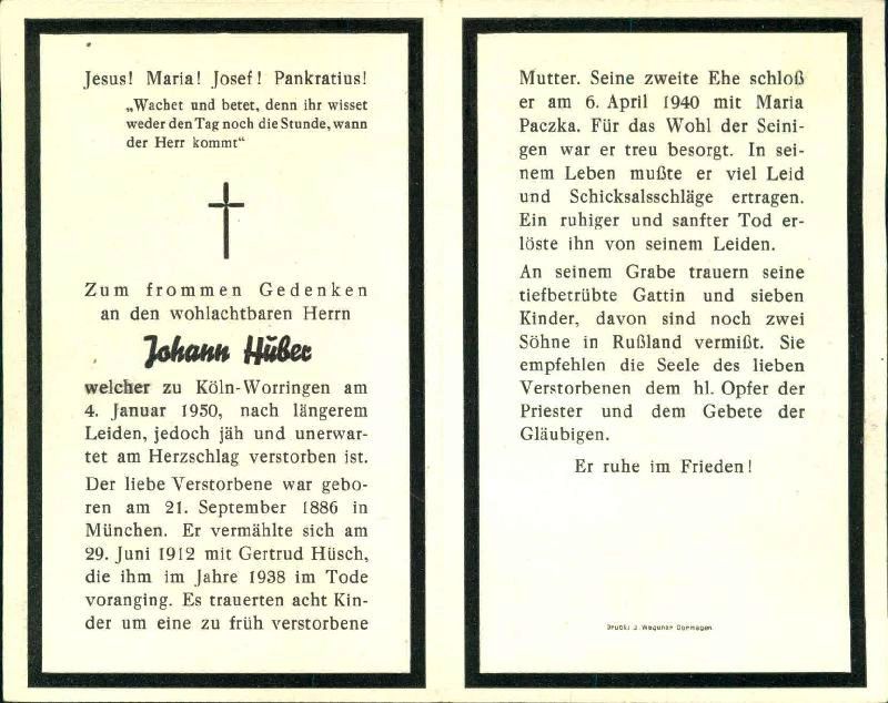 | Totenzettel-Nr.: | 30311 |  | Name: | Huber |  | Vorname: | Johann |  | Geburtsort: | München |  | Geburtsdatum: | 21.09.1886 |  | Sterbeort: | Köln-Worringen |  | Sterbedatum: | 04.01.1950 |  | Bearbeiter: | Manuela Jansen |  | Sammlung: | Heimatarchiv Worringen e.V. |  | Sonstiges: |  | ∞ 29.6.1912 Gertrud Hüsch † 1938, 8 Kinder davon 2 in Rußland vermisst (am Grab 7 Kinder, vermutlich 1 Tochter Anni 9.5.1949 †); ∞ 6.4.1940 Maria Paczka |  |