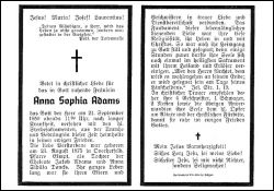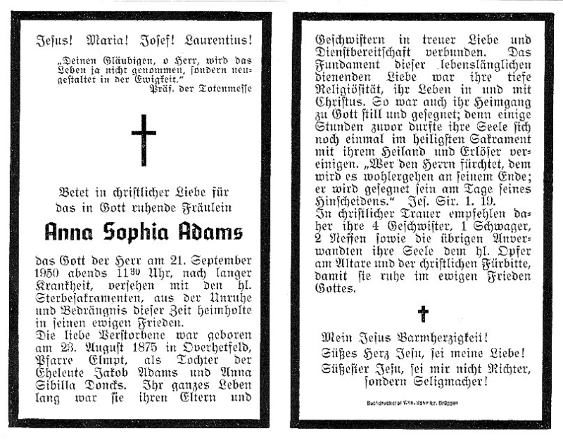 Fräulein; Eltern: Jakob Adams u. Anna Sibilla geb. Doncks; lebte bei ihren Eltern und Geschwistern; Druck in Brüggen, Ndrh. |