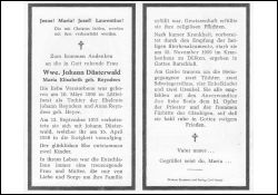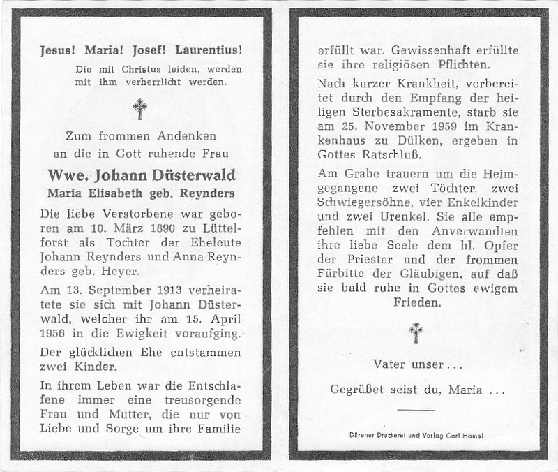 Eltern: Johann Eynders u. Anna geb. Heyer; ∞ 13.9.1913 Johann Düsterwald, † 15.4.1956; 2 K. |