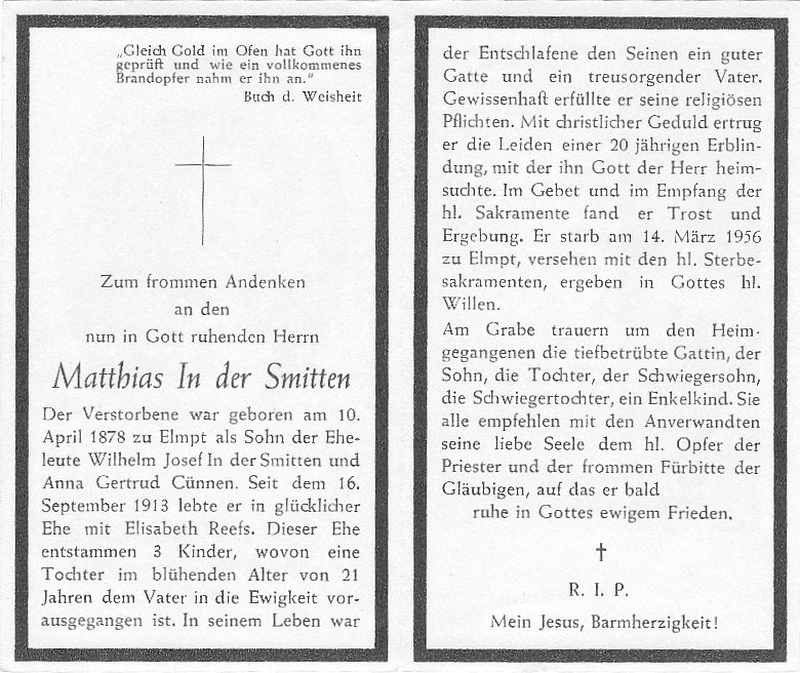 Eltern: Wilhelm Josef In der Smitten u. Anna Gertrud geb. Cünnen; ∞ 16.9.1913 Elisabetrh Reefs; 3 K., davon 1 Tochter mit 21 J. †; 20-jährige Erblindung; |