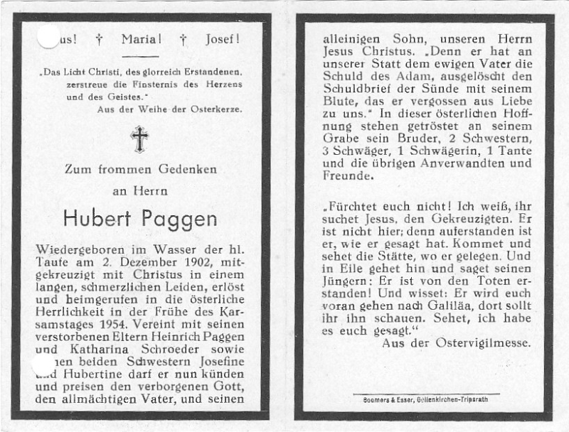 Taufe am 2.12.1902; Eltern: Heinrich Paggen u. Katharina geb. Schroeder, beide †; 2 Schwestern (Josefine, Hubertine) †; Druck in Geilenkirchen-Tripsrath |