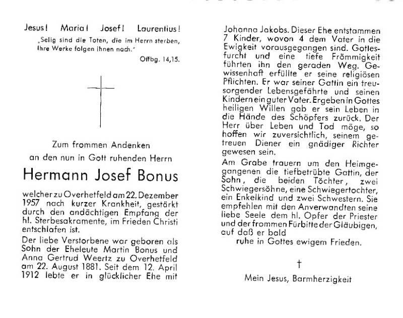 | Eltern: Martin Bonus u. Anna Gertrud geb. Weertz; ∞ 12.4.1912 Johanna Jakobs; 7 K., davon 4 †; |