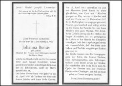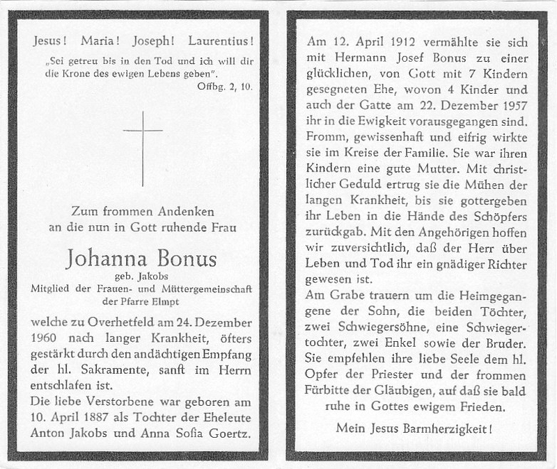 | Mitgl. Frauen- u. Müttergemeinschaft der Pfarre Elmpt; lange Krankheit; Eltern: Anton Jakobs u. Anna Sofia geb. Goertz; ∞ 12.4.1912 Hermann Josef Bonus, † 22.12.1957; 7 K., davon 4 † |