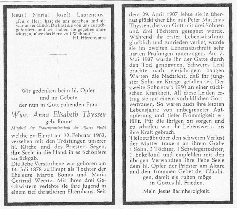 | Eltern: Martin Bonus u. Maria Gertrud geb. Weertz; ∞ 29.4.1907 Peter Matthias Thyssen, † 7.5.1937; 6 K.; jüngster Sohn im 2. Weltkrieg gefallen; ihr 2. Sohn † 1950 |