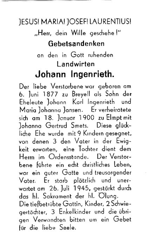 | Landwirt; Eltern: Johann Karl Ingenrieth u. Maria Johanna geb. Jansen; ∞ in Elmpt 18.1.1900 Johanna Gertrud Smets; 9 K., davon †; 1 Tochter im Ordensstand |