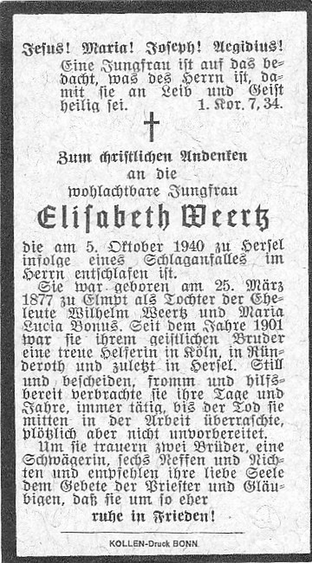 | Jungfrau; Schlaganfall; Eltern: Wilhelm Weertz u. Maria Lucia geb. Bonus; seit 1901 führte sie ihrem geistl. Bruder den Haushalt in Köln, Ründeroth und zuletzt in Hersel; Druck in Bonn |