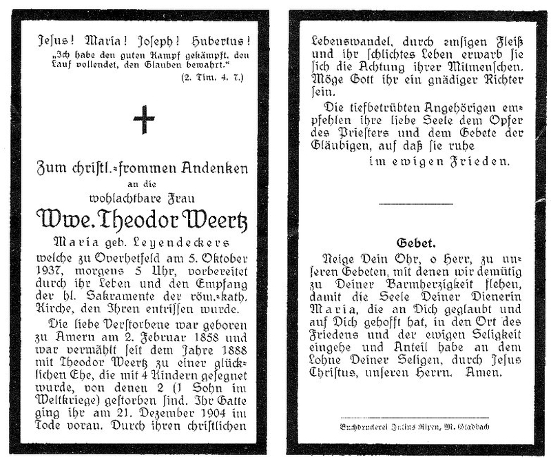 | ∞ 1888 Theodor Weertz; 4 K., davon 1 † und 1 Sohn im 1. Weltkrieg gefallen; Druck in Mönchengladbach |