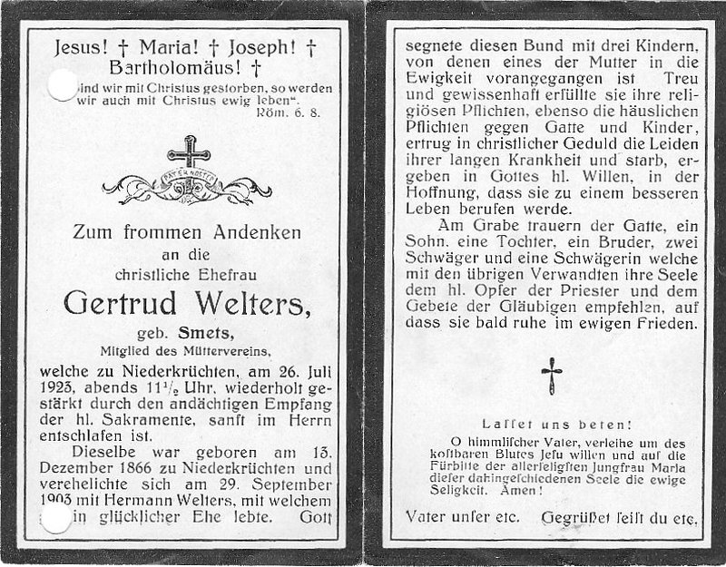 | Mitgl. Mütterverein; ∞ 29.9.1903 Hermann Welters; 3 K., davon 1 †; |