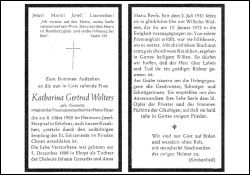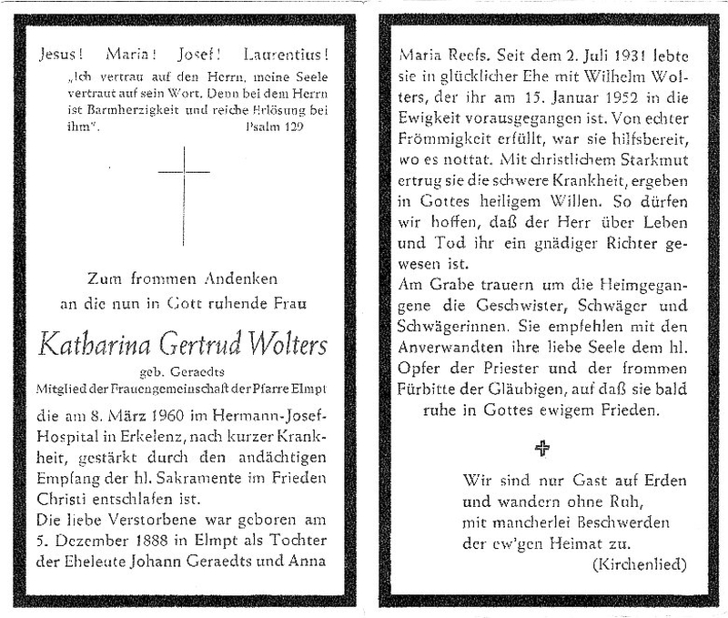 Mitgl. Frauengemeinschaft der Pfarre Elmpt; Eltern: Johann Geraedts u. Anna Maria geb. Reefs; ∞ 2.7.1931 Wilhelm Wolters, † 15.1.1952; |