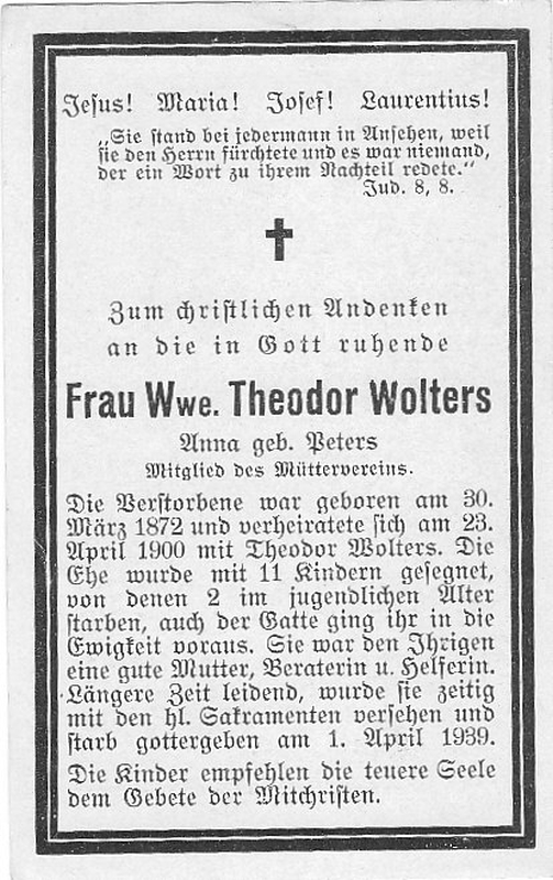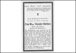 ∞ 23.4.1900 Theodor Wolters, †; Mitgl. Mütterverein; 11 K., davon 2 jugendl. †; |