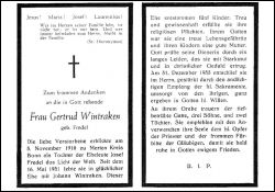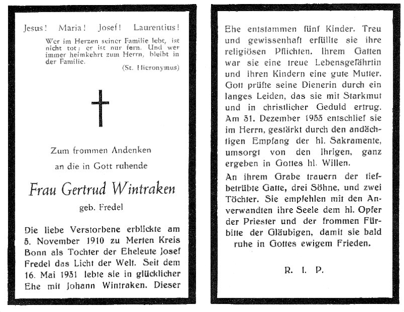 Eltern: Ehel. Josef Fredel; ∞ 16.5.1931 Johann Wintraken; 5 K.; langes Leiden |