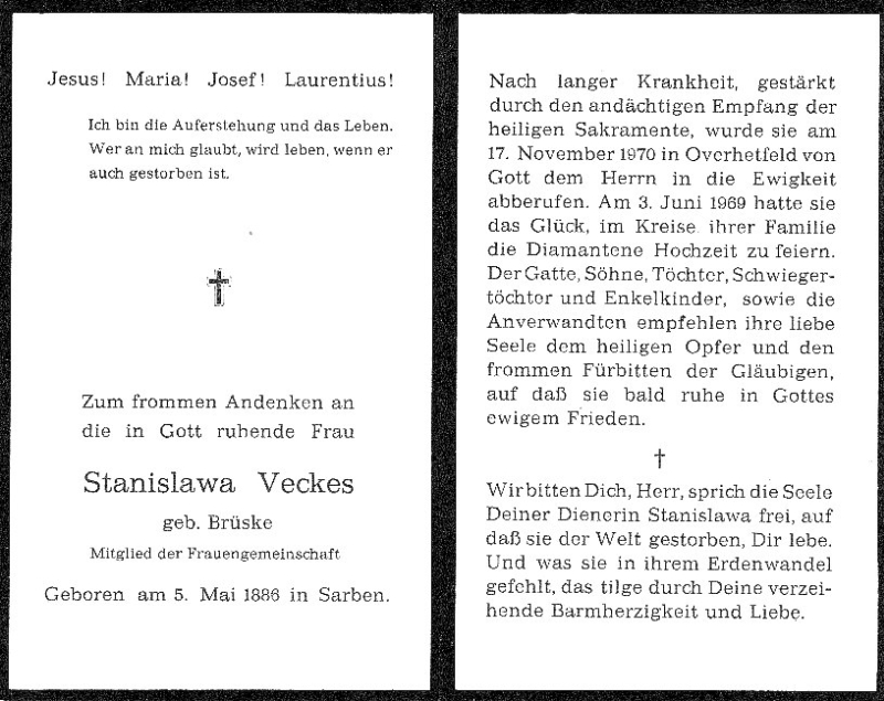 Lange Krankheit; Mitgl. Frauengemeinschaft; Diamantene Hochzeit 3.6.1969; Kinder |