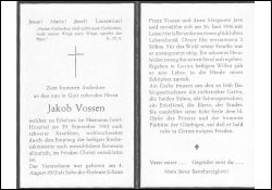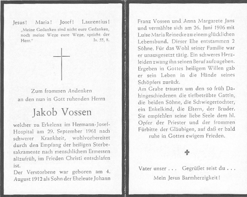 Eltern: Johann Franz Vossen u. Anna Margarete geb. Jans; ∞ 26.6.1936 Luise Maria Reinecke; 2 Söhne; Schweres Herzleiden |