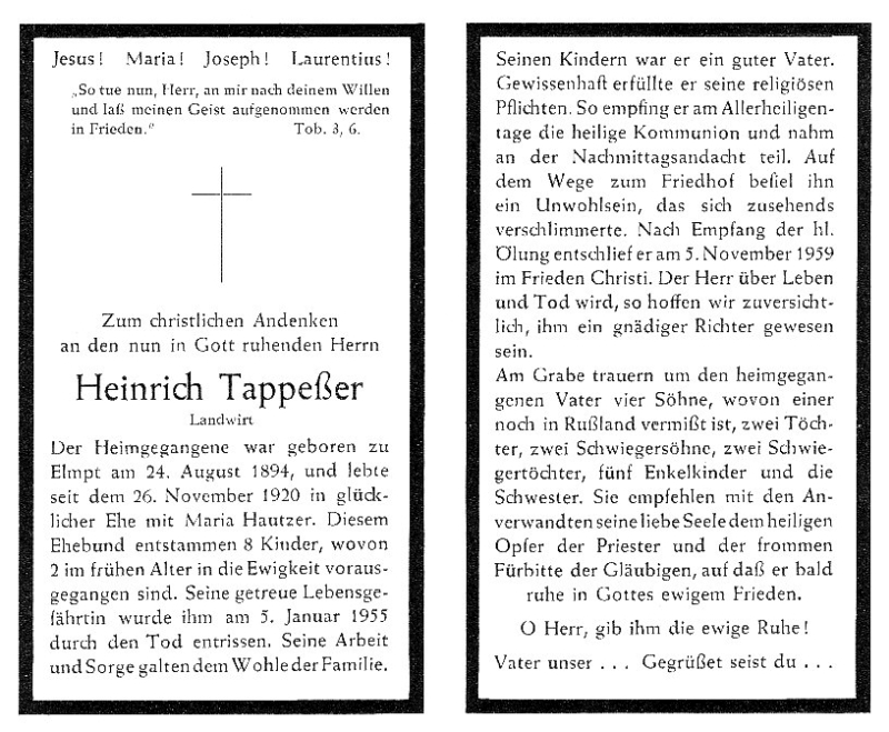 Landwirt; ∞ 26.11.1920 Maria Hautzer, † 5.1.1955; 8 K., davon 2 früh †; 1 Sohn im 2. Weltkrieg in Russland vermisst; |