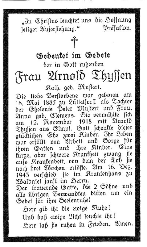 Eltern: Peter Mustert u. Anna geb. Clemens; ∞ 12.11.1918 Arnold Thyssen aus Elmpt; 2 K. |