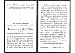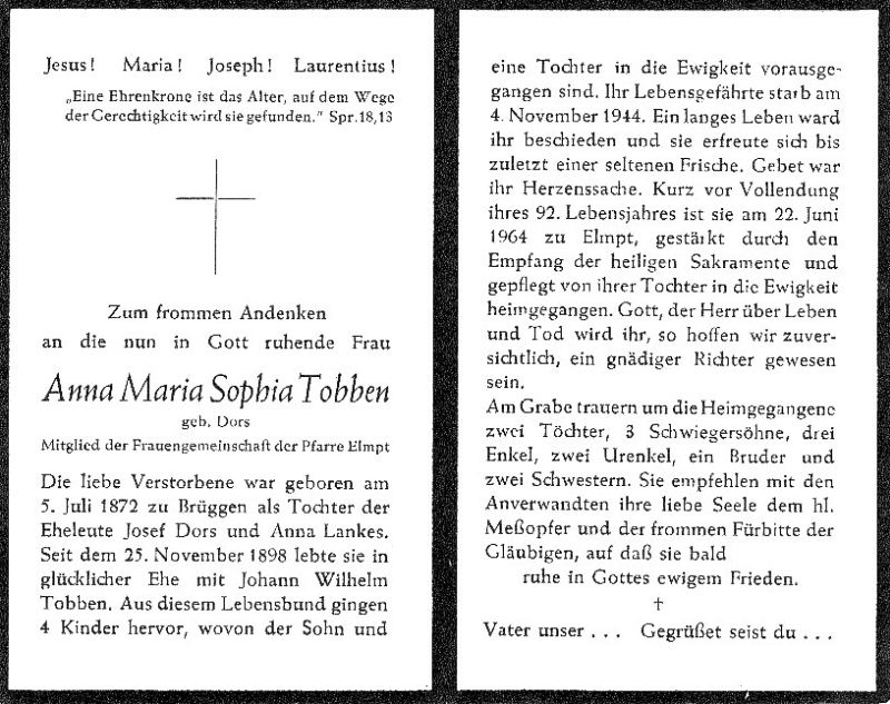 | Mitgl. Frauengemeinschaft der Pfarre Elmpt; Eltern: Josef Dors u. Anna geb. Lankes; ∞ 25.11.1898 Johann Wilhelm Tobben, † 4.11.1944; 4 K., davon 2 †; |