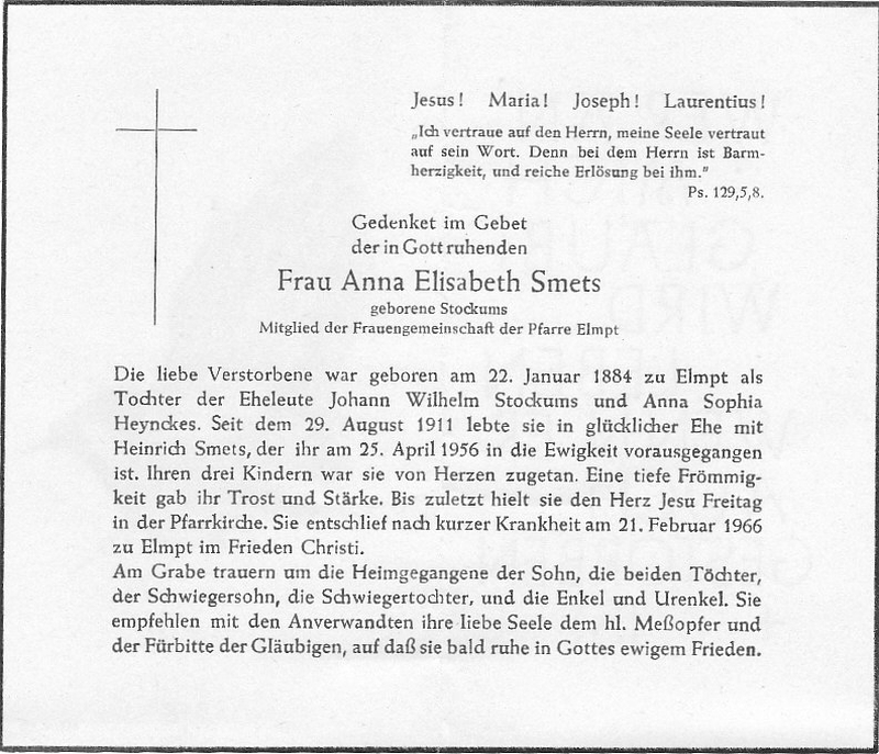 | Mitgl. Frauengemeinschaft der Pfarre Elmpt; Eltern: Johann Wilhelm Stockums u. Anna Sophia geb- Heynckes; ∞ 29.8.1911 Heinrich Smets, † 25.4.1956; 3 K. |