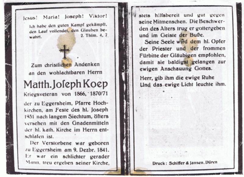 | Kriegsveteran von 1866 und 1870/71; Verwalter auf dem Heuserhof in Oberbolheim; langes Siechtum; er starb im Haus seiner Schwester Konstanze Krudewig in Eggersheim; ledig; unehelicher Sohn: Josef Kentenich, geb. 16.11.1885, später Pallottinerpater und Gründer der Internationalen Schönstattbewegung; benannt nach seiner Mutter Katharina Kentenich |