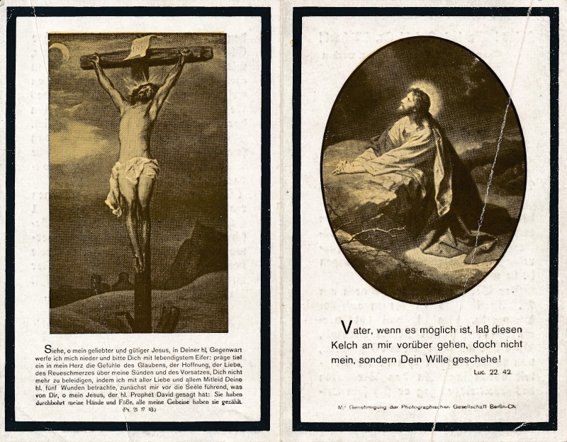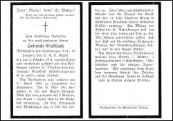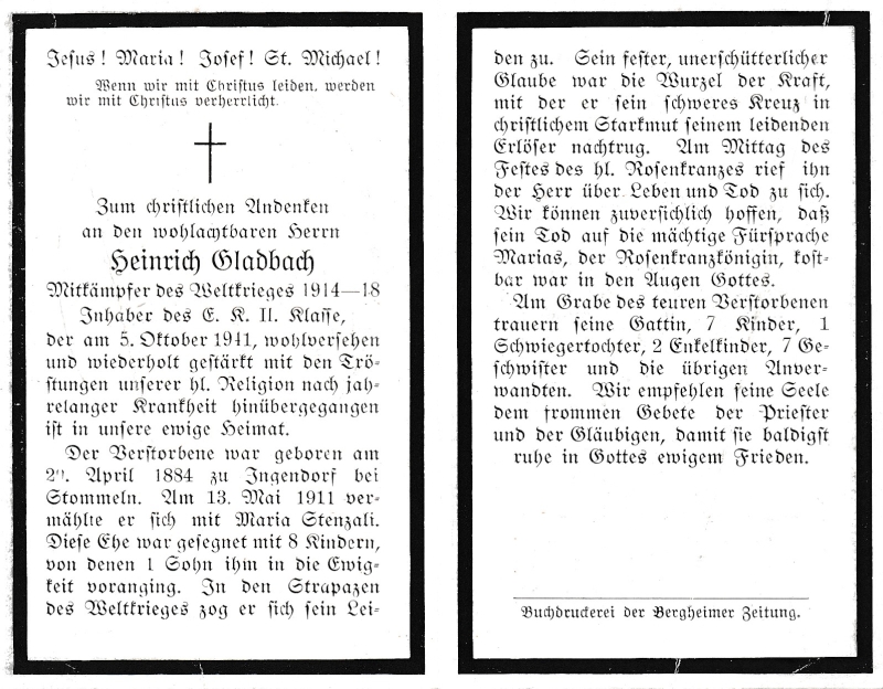 | Soldat im 1. Weltkrieg; ∞ 13.5.1911 Maria Stenzali; 8 K., davon 1 Sohn †; in den Strapazen des 1. Weltkrieges zog er sich ein Leiden zu; Druck in Bergheim/Erft |