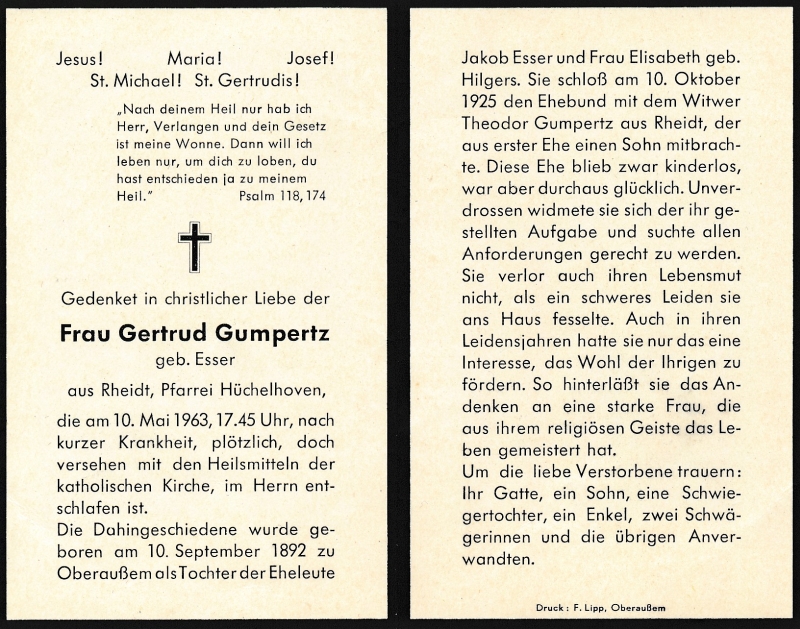 | Eltern: Jakob Esser u. Elisabeth geb. Hilgers; ∞ 10.10.1925 Witwer Theodor Gumpertz aus Rheidt (mit 1 Sohn aus 1. Ehe); schweres Leiden fesselte sie ans Haus; Druck in Oberaußem |