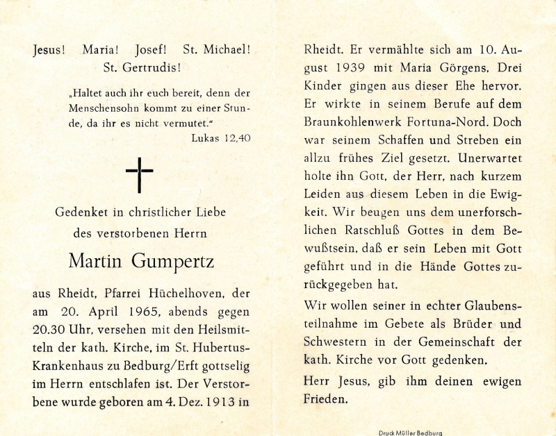 | Wohnort: Rheidt; ∞ 10.8.1939 Maria Görgens; 3 K.; beschäftigt in dem Braunkohlekraftwerk Fortuna-Nord; Druck in Bedburg/Erft |