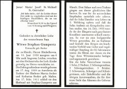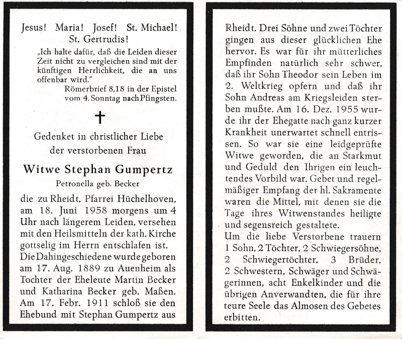 | Eltern: Martin Becker u. Katharina geb. Maßen; ∞ 17.2.1911 Stephan Gumpertz aus Rheidt, † 16.12.1955; 5 K.; Sohn Theodor im 2. Weltkrieg gefallen und Sohn Andeas an einem Kriegsleiden verstorben |