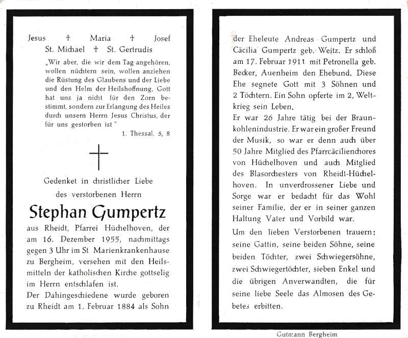 | Eltern: Andreas Gumpertz u. Cäcilia geb. Weitz; ∞ 17.2.1911 Petronella Becker aus Auenheim; 5 K.; 1 Sohn im 2. Weltkrieg gefallen; 26 J. in der Braunkohlenindustrie tätig; über 50 J. Mitgl im Pfarrcäcilienchor Hüchelhoven u. des Blasorchesters von Rheidt-Hüchelhoven; Druck in Bergheim/Erft |