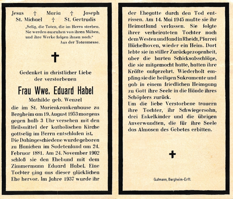 | ∞ 24.11.1902 Eduard Habel, von Beruf Zimmermann, † 1937; 1 Tochter; am 14.5.1945 aus der Heimat vertrieben; neue Heimat in Rheidt, wo sie zurückgezogen lebte |