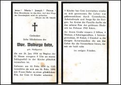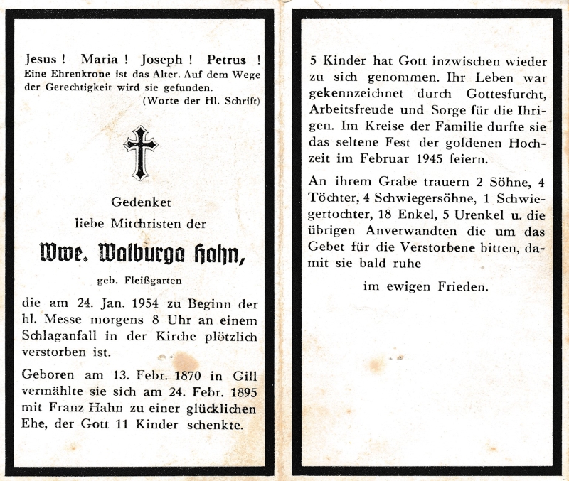 | Tod durch Schlaganfall im Gottesdienst; ∞ 24.2.1895 Franz Hahn; 11 K., davon 5 †; Goldhochzeit Februar 1945 |