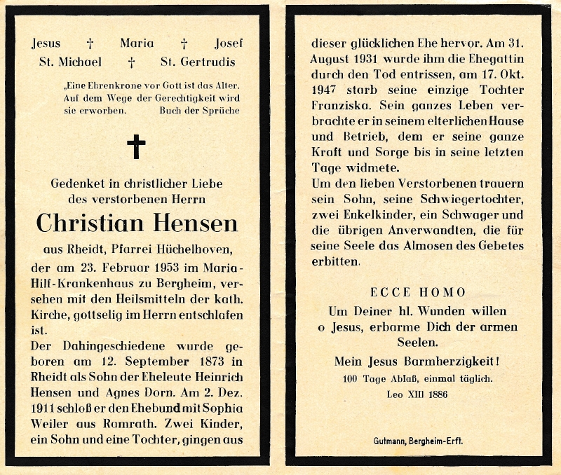 Wohnort: Rheidt; Eltern: Heinrich Hensen u. Agnes geb. Dorn; ∞ 2.12.1911 Sophia Weiler aus Ramrath, † 31.8.1931; 2 K., davon Tochter Franziska † 17.10.1947; sein ganzes Leben im elterlichen Haus und Betrieb |