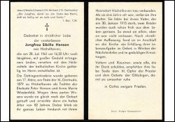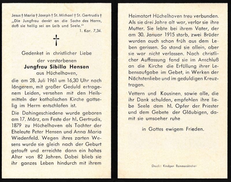 Jungfrau; Wohnort: verbrachte ihr ganzes Leben in Hüchelhoven; längeres Leiden; von Geburt an schwach; Eltern: Peter Hensen u. Anna Maria Wiedenfeld; mit 3 J. verlor sie die Mutter; lebte bei ihrem Vater, † 30.1.1915; auch 2 Brüder starben |