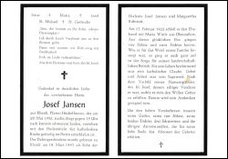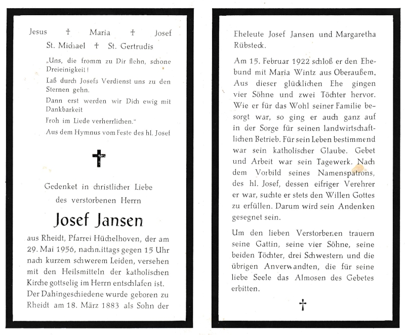 Eltern: Josef Jansen u. Margaretha geb. Rübsteck; ∞ 15.2.1922 Maria Wintz aus Oberaußem; 6 K.; landwirtgschaftl. Betrieb; |