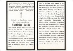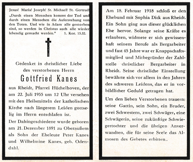 | Eltern: Peter Kanes u. Wilhelmine geb. Odendahl; ∞ 18.2.1918 Sophia Dick aus Rheidt; 1 Sohn; Bergarbeiter; 45 J. in der Knappschaft; Mitbegründer der Zahlstelle christlicher Bergarbeiter in Rheidt; schweres Leiden |